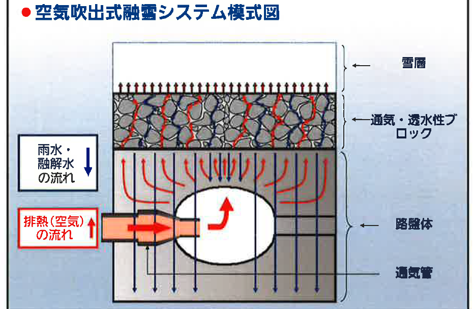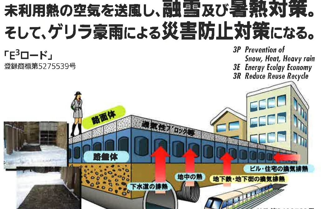 E3ロードは、透水(通気)性の空気吹き出し可能な路面体と、その下部には貯水可能な空洞体の路盤体で構成されています。